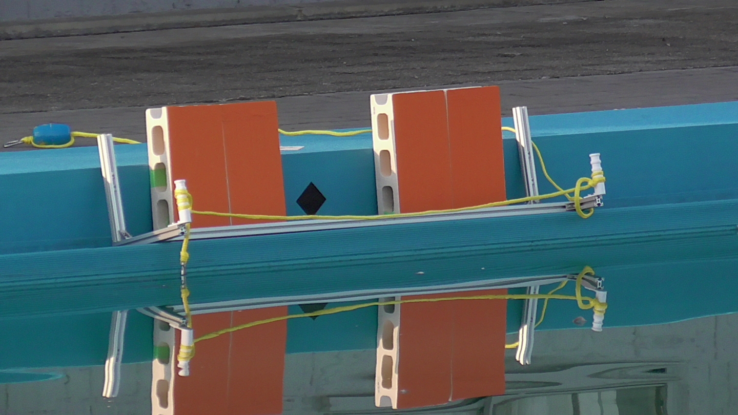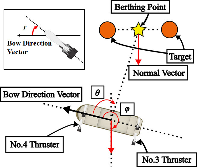 ロボット漁船は4つのストラット付きスラスターにより自由自在な操船を容易にする特徴を持っています。ステレオ画像によって得られた測距データに基づきスラスター向き、及び推力を制御して着岸点に向けて制御をしていきます。