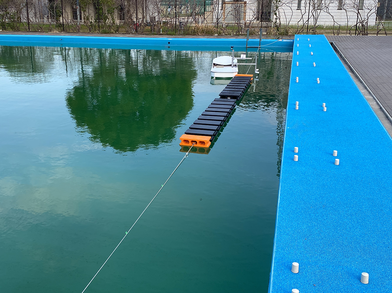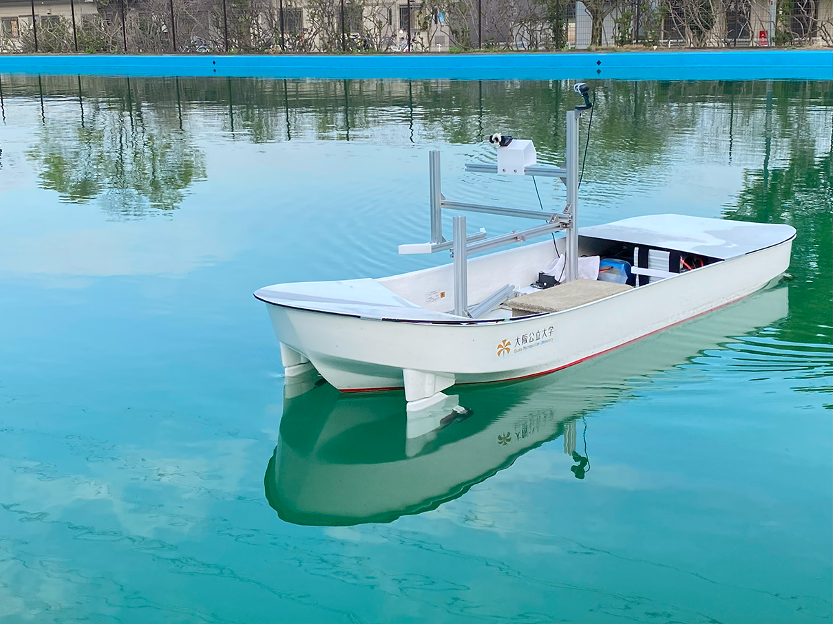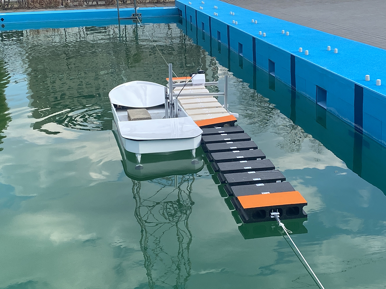 卒業研究ではバスケットの画像による抽出は出来ましたが、船と最初にひっくり返すバスケットとの距離までは分かりません。修士1回生の時は距離推定の問題に取り組みました。そして距離推定が出来るようになり、当研究室で開発が進んでいるロボット漁船の模型を用いてプールで牡蠣バスケットを模擬したラインに沿って走る技術を構築することに成功しました。次の目標は、風や流れのある中でのロボット漁船のシミュレーション技術を通した操船技術の高度化です。