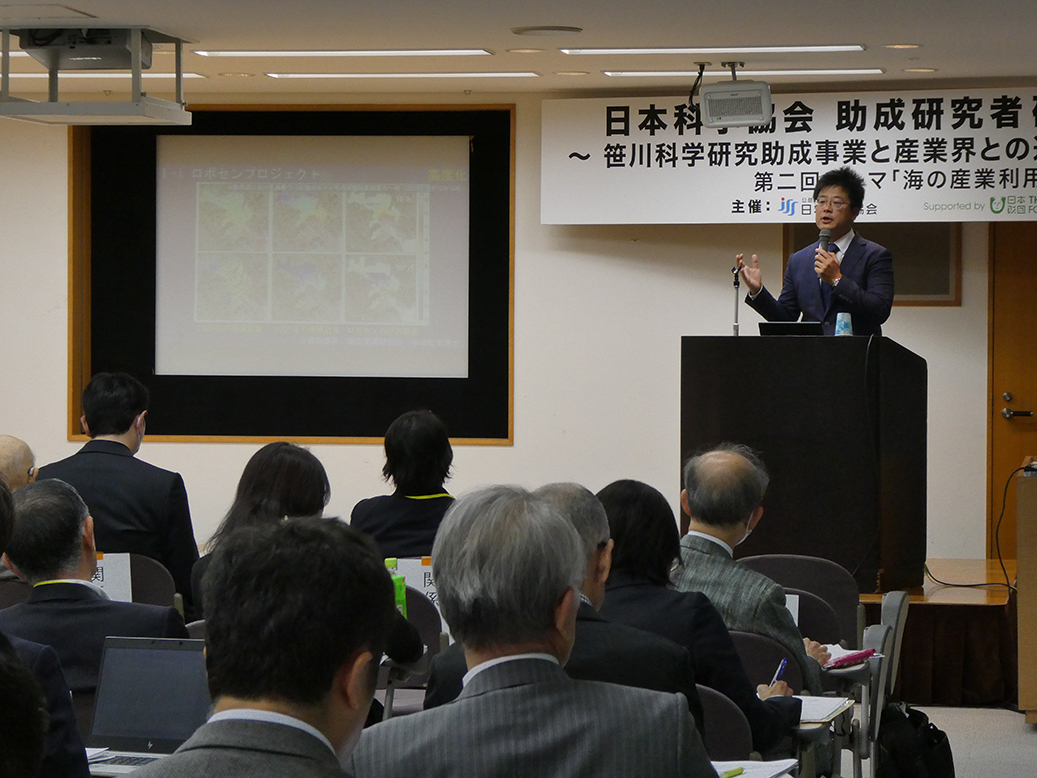 (公益財団法人)日本科学協会では笹川科学研究助成を行っています。過去に二瓶もこの研究助成を何度か受けており、OBとして講演をしました。本発表会は「海の産業利用」をテーマにしており、「自動航行船の研究開発と水産養殖における利活用」をテーマに講演しました。