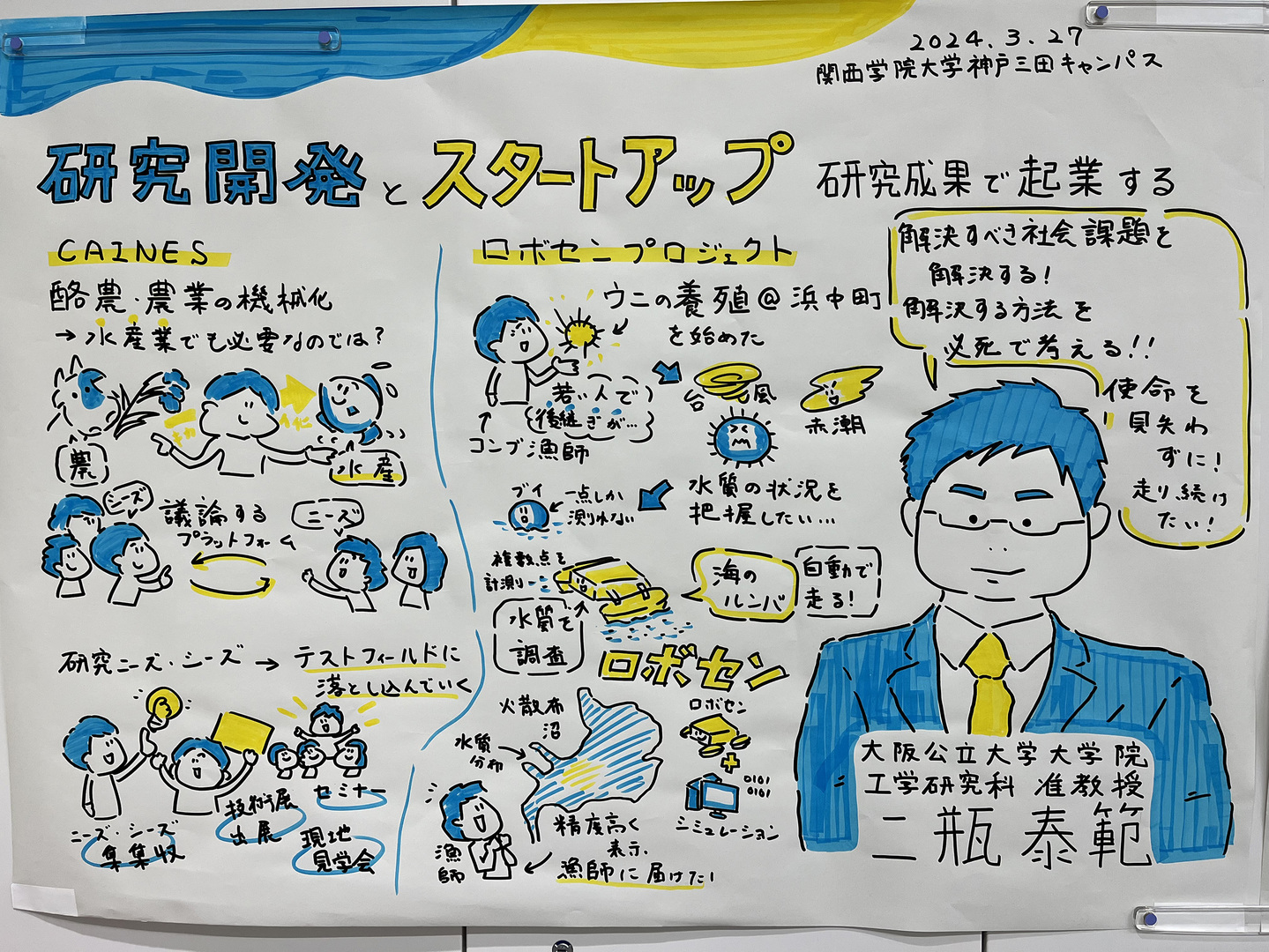 大学発スタートアップということで、(株)ロボティクスセーリングラボの起業、これまで携わってきた社会実装の話、立ち上げた大阪公立大学養殖場高度化推進研究センターの話をさせてもらいました。