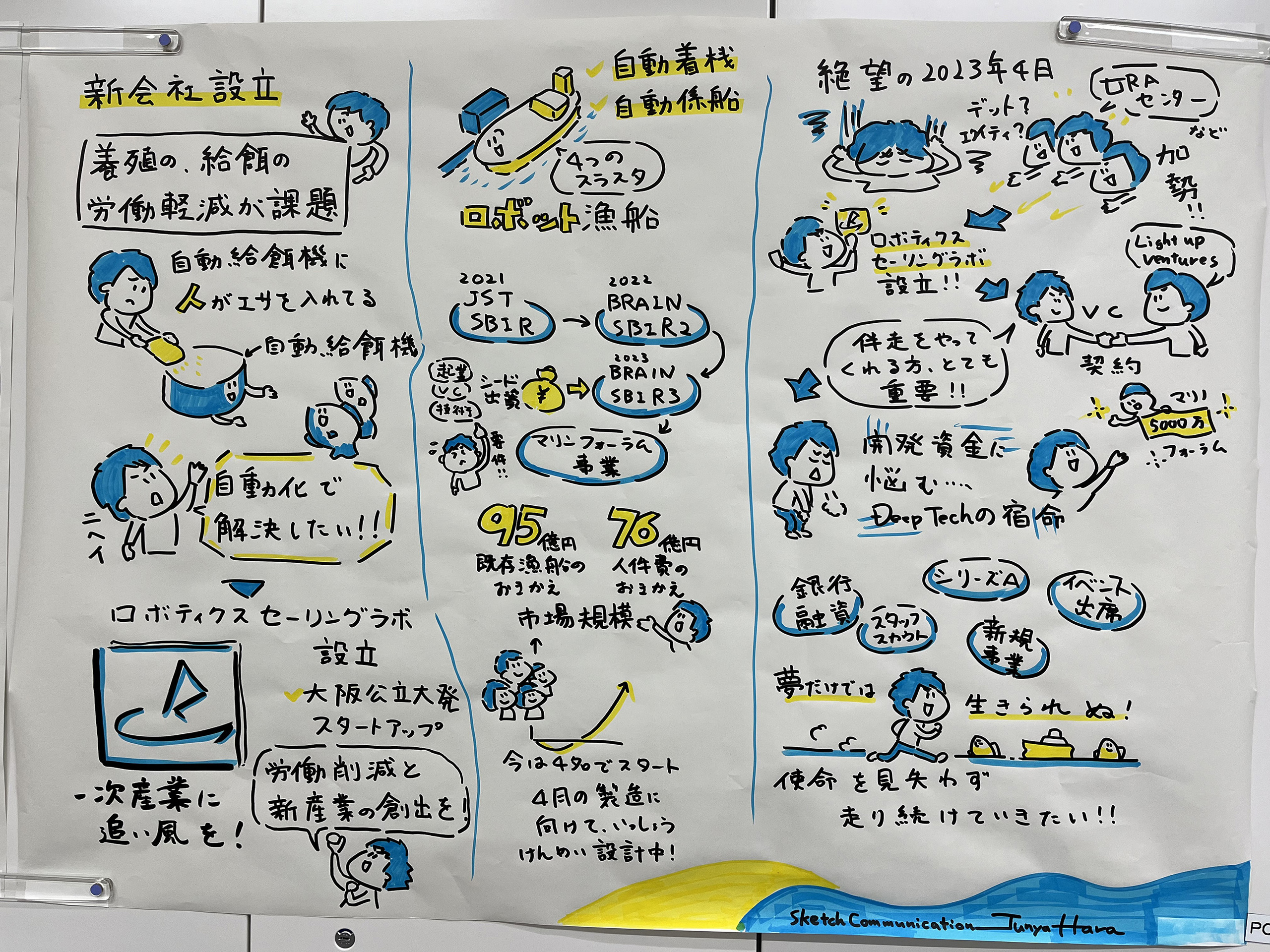 ここで(株)ロボティクスセーリングラボの設立経緯をお話しさせて頂きました。話した内容は、Sketch Communication原純哉氏がリアルタイムに言葉とイラストで描き出し、非常に分かり易く話した内容が参加者と共有されました。